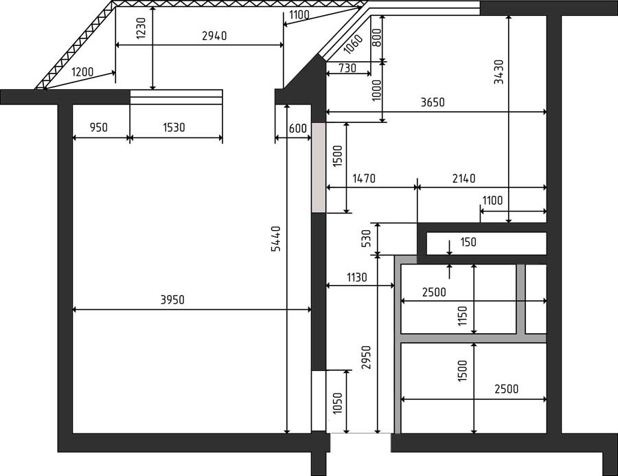 Дано: Есть отдушка в новостройке. Ремонта нет - голые стены. Планировка ниже. Темным выделены капитальные стены (посредине кухни темный прямоугольник - это вентиляция и трубы серым выделены не капитальные стены, которые можно сносить. светлая часть в стене на кухне - тоже не капитальная стена, т.е. там можно прорубить ход!Общая площадь (включая лоджию) около 49 метров.