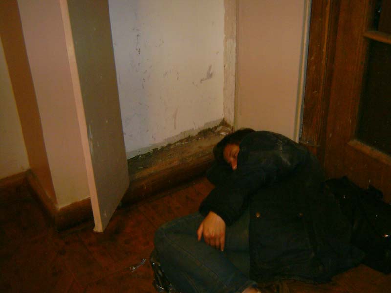 Вот прям сейчас в "V", на 17-ом у лестницы, со стороны центрального крыла, спит бомжиха!