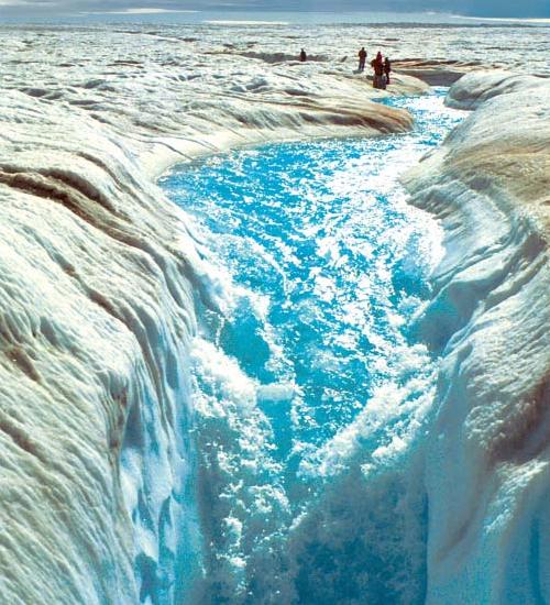 И это не единственная положительная обратная связь в этом процессе глобального изменения климата. Вот фотка, как Гренландия тает, промоины образуются и вода спускается под ледник, до ложа. Вода играет роль смазки, что в расчётах не учитывалось. Ледник быстрее сползает в океан, откалываются айсберги, в океане они быстрее тают.