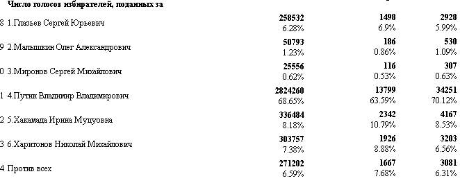 -Ну, путин с большим отрывом и без второго тура (что сразу ясно было). Непонятно, кто займёт 2-4 места (данных по одному участку недостаточно).