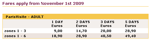 Что же такое Paris Visite? Это карточка, действующая определенное число дней (1, 2, 3 или 5) и на определенное число транспортных зон (3, 5 или 8). Стоит Paris Visite от 8,35 евро (1 день в 3 центральных зонах) до 53,35 евро (5 дней во всех 8 зонах).