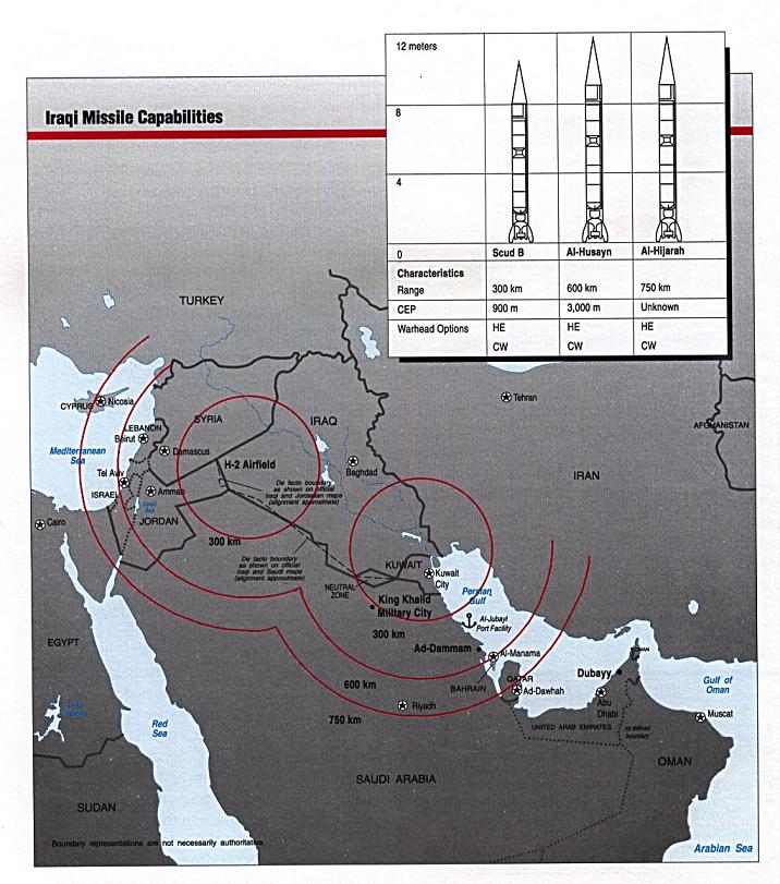 Вот есть карта саддамовских ракетных потуг, из которой видно, что от Синая до Багдада километров где-то тыща: