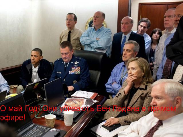«Было ли разведывательное сообщество и ЦРУ в курсе всей этой ситуации, ответом является «да», категорическое Да», сказал Печеник, ссылаясь на заявки администрации Обамы о том, что Бен Ладен был убит в воскресенье в его его резиденции в Пакистане, добавив: «Весь этот сценарий, в котором вы видите, что куча людей сидит, смотрит на экран, и они выглядят, как будто они чем то сильно озабочены, это чепуха », говоря про телекартинку, распространенную Белым домом, в которой мы видим Байдена, Обаму и Хиллари Клинтон, напряженно наблюдающих за операцией, по «уничтожению» Бен Ладена в режиме прямой трансляции на телевизионном экране.