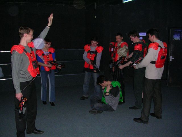 Светлое не надо одевать, там есть лампы как на дискатеках - светлое синим светится - очень видная мишень, если базу не собираешься охранять, то не одевайся так. Обувь спортивную, верх легкий, что бы не вспотеть. (Там раздевалка есть, если есть рюкзак, я бы с собой легкую одежду взял (Это имхо