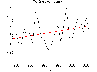 Но концентрация CO_2 растёт примерно квадратично, что из только что приведённого графика следует - на котором если прямую регрессии построить будет линейный рост скорости ppm в год. Вот с линейной регрессией