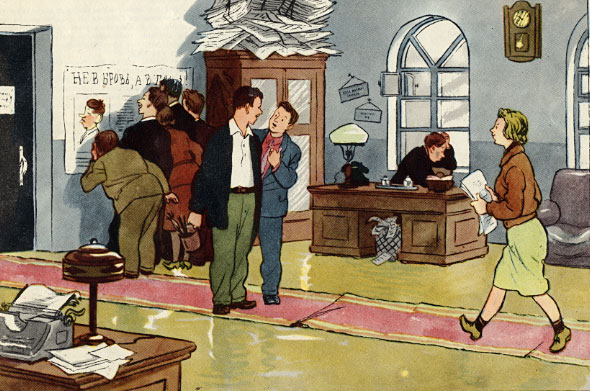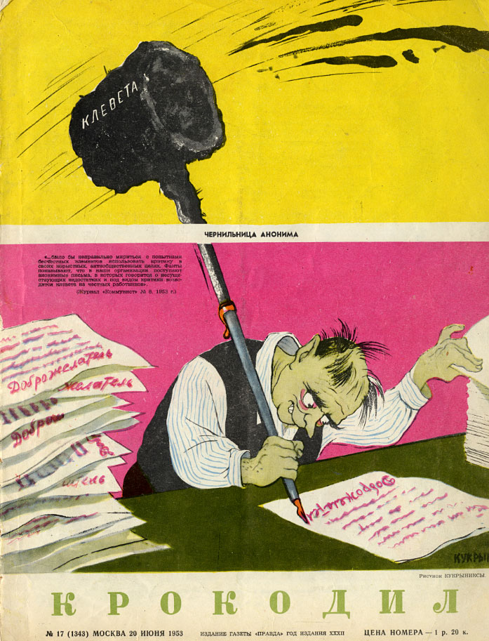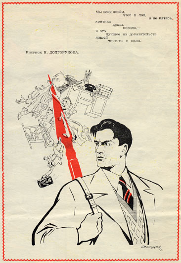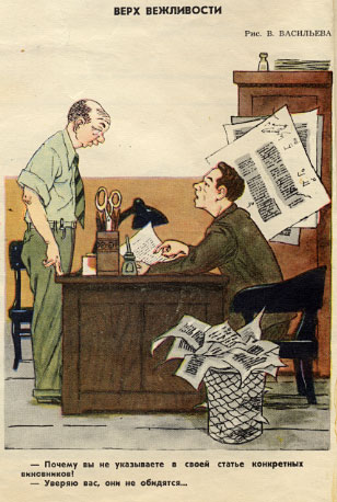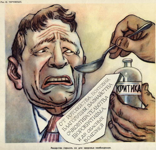 Товарищи журналисты, навострили перья, "сверху" распоряжение: власть можно критиковать!Ага, вот даже картинки в тему. про борьбу с зажимателями критики. Крокодил, 1953 год.