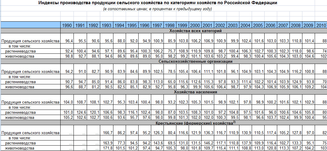 Ты просто привёл причины, по которым по этим цифрам может быть нельзя судить о насущности, на что я собственно и намекал.табличка показывает один факт - в начале 90-х количество продукции, произведенной в ЛПХ, резко возросло; то есть масштабы выращенного в теплицах в запомнившиеся -у 80-е были несколько скромнее