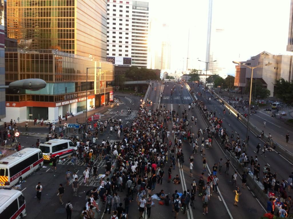 Вчера пошли на Civic Square (площадь перед комплексами парламента и правительства Гонконга которую государство закрыло для посещения ещё в июле, и огородило трёхметровым забором. Пара сотен человек застала полицию врасплох, прошла внутрь, ещё несколько тысяч стояло снаружи. Полиция сначала не знала, что с этим делать, потом начала действовать жёстко, распылять перцовый газ (вроде его применение против безоружных запрещено не помогло. В результате, всю ночь перед Civic Square стояло около двух тысяч студентов, которых пыталась разогнать полиция. Утром народ начал подтягиваться, к 14 часам было уже около 5 тысяч, к 18 - около 10 тысяч. Построили баррикады из металлических ограждений. Напоминает начало Майдана.