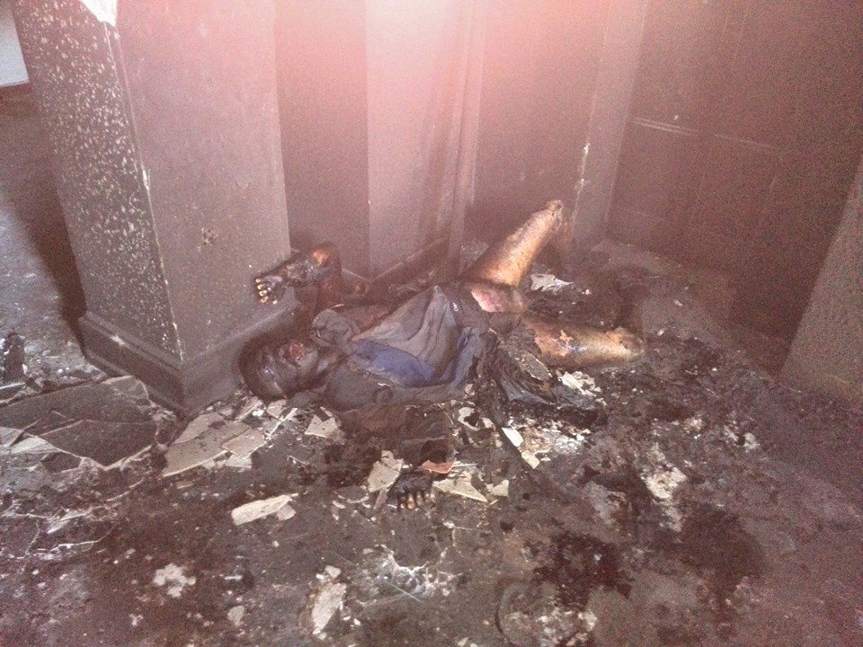 Женщина у лифтовой шахты без одежды ниже пояса. Скорее всего её изнасиловали, а потом облили голову горючей смесью и сожгли.
