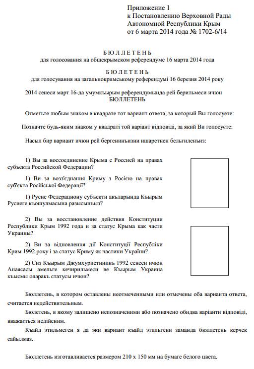 Причём опции остаться автономией в Украине на бюллетене не было.Второй же вопрос был про это: «Вы за восстановление действия Конституции Республики Крым 1992 года и за статус Крыма как части Украины?»