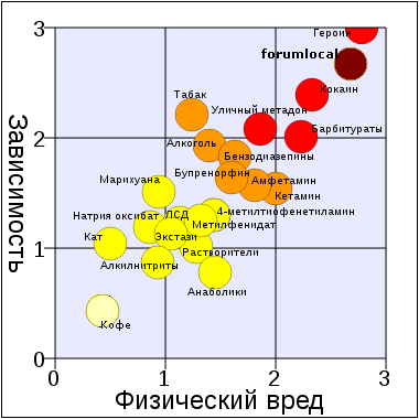 Как видно, алкоголь находится на одном графике с такими опасными наркотическими веществами, как кокаин, героин, экстази и ЛСД