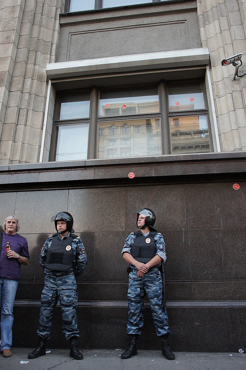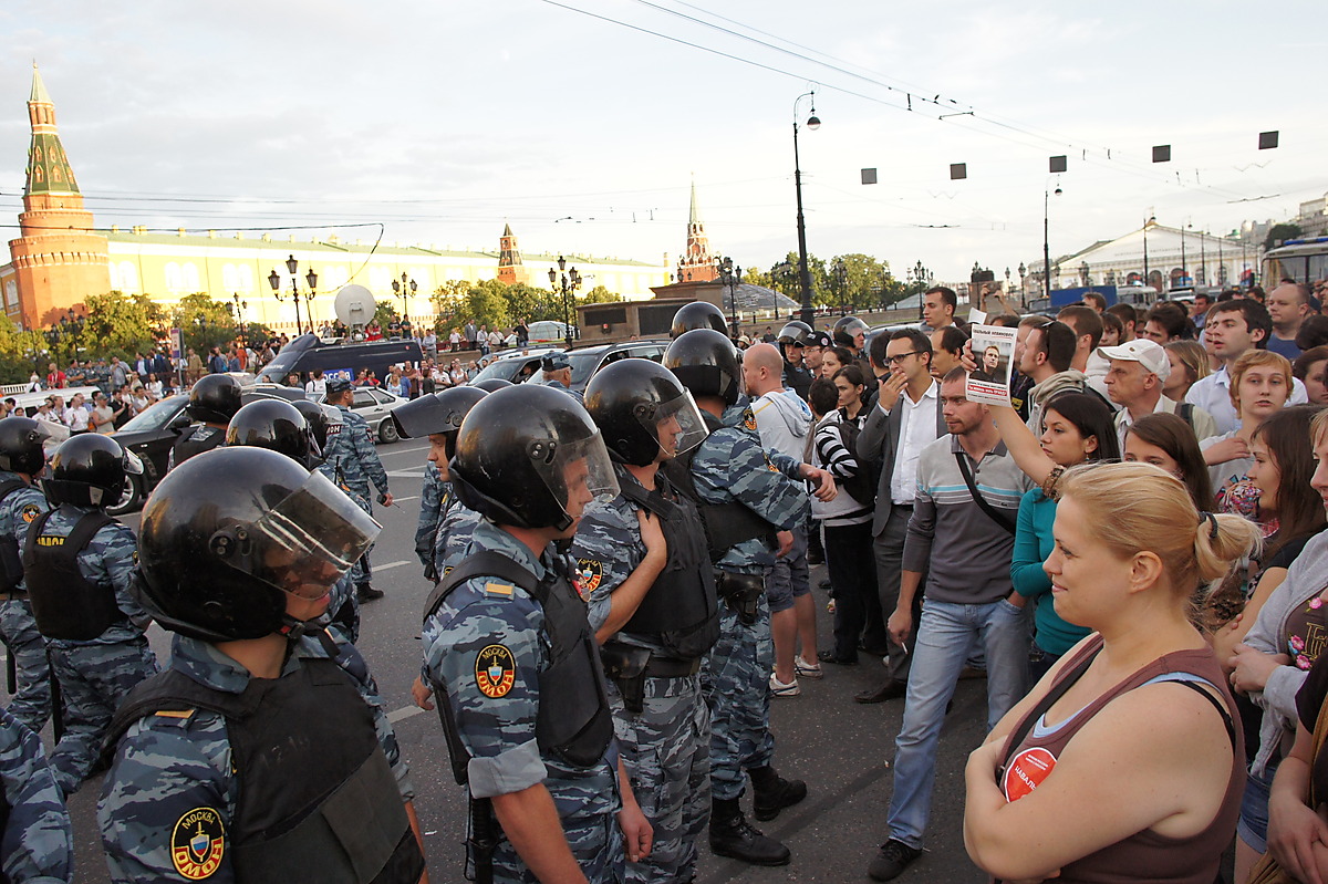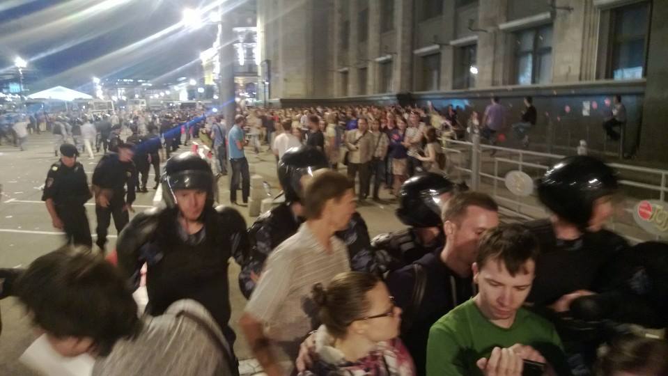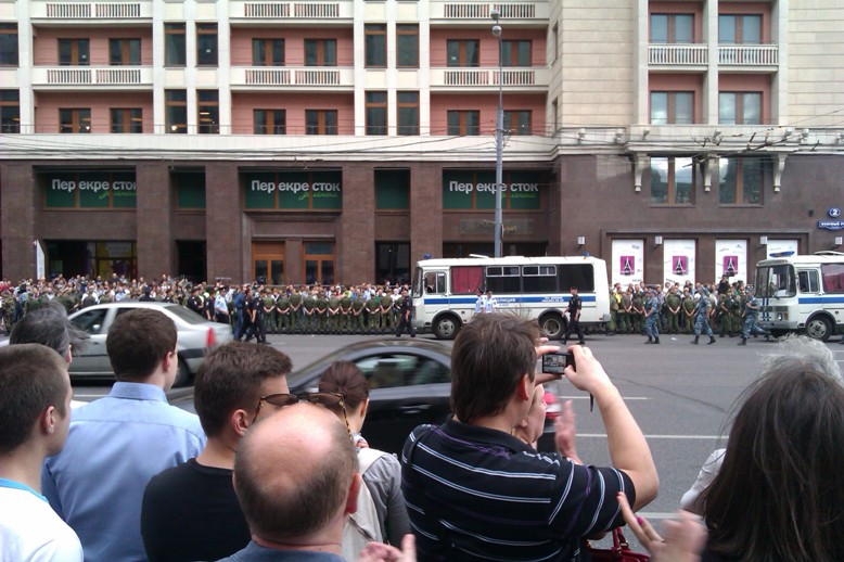 Вообще, "почему не разгоняли" и т.п. Всё просто. Когда людей мало, разгоняют, когда много — улыбаются. Так всегда бывает. Разогнать большую толпу крайне сложно (6-го мая тому пример в добавок, на следующий день тогда в разы больше придёт, как это было в декабре 2011. Когда люди только собирались, крутить пытались. Ближе к ночи тоже, уже хорошо винтили. А вечером, когда масса собралась, терпели и многое позволяли, выбора не было.