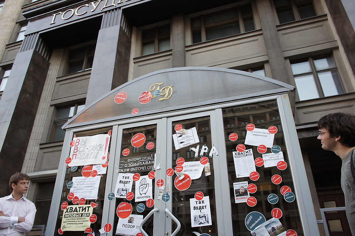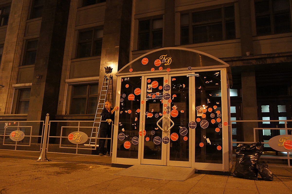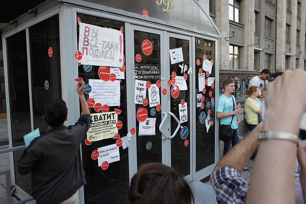 раздавали наклейки, с нашей стороны были эти, "Навальный невиновен", со стороны ГД было больше круглых (Навальный наш мэр, или как-то так).