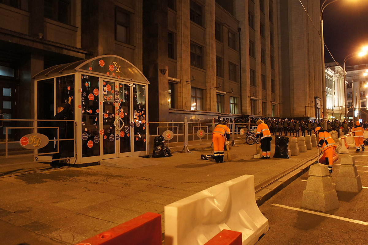 Было не понятно, чего ждать. В частности, будет ли народ подходить, либо, наоборот, расходиться. Вообще жизнь какая-то была там, как на окупаях. Я решил отойти, чтобы спокойно поесть, просто прогуляться, дабы потом вернуться. Когда вернулся, народ перед ГД уже разогнали, и начали винтить в боковых улицах. Каких-то больших толп с соответствующей энергией не было, винтили случайно, в общем, глубокого смысла в подобных "гуляниях" я не видел, и быстро отсоединился. Обошёл ГД (к слову, охранники на тыльной стороне ГД явно стремались, что вот толпа повернёт и пойдёт к ним). Спокойно походил, что-то пофоткал. Потом уехал домой.