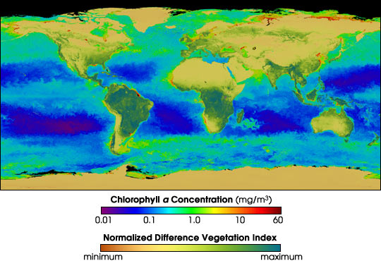 The above image shows the amount of chlorophyll present in the oceans, and the amount of vegetation on land. Purple and blue represent low levels of chlorophyll, while green, yellow, and red indicate progressively higher concentrations. On land, brown pixels show areas of little vegetation, while blue-green represents dense vegetation.
