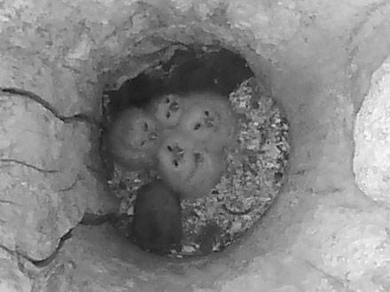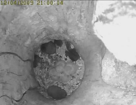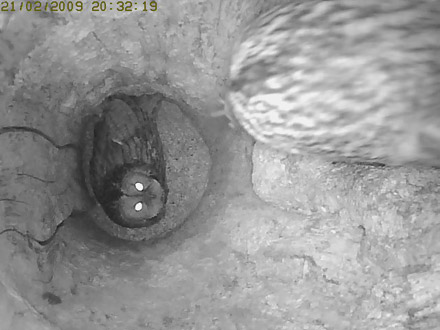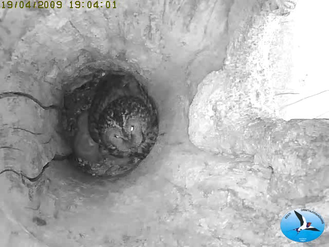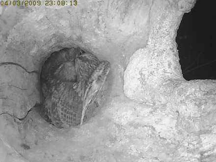 Трансляция началась 3 февраля, может быть, в марте-апреле в дупле появятся совята. Изображение ч/б потому что в инфрасвете.