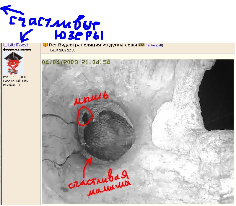 Днем хорошо видно неподвижную птицу, ночью - пустое дупло. Прямой эфир клево, но хочется посмотреть что-то вроде "best of Сова в дупле", нарезку удачных кадров какую-нибудь.