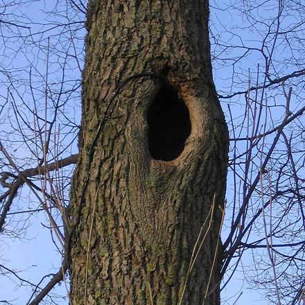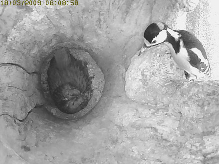А теперь там сидит только один, ходит по дуплу и стучит клювом по дну и иногда выбирается посмотреть на мир