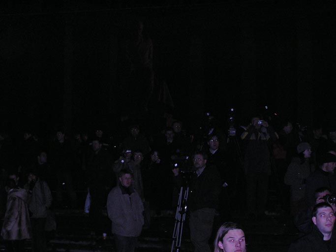 Там еще прикол был - со стороны библиотеки (откуда фотки с толпой зевак) стояло довольно много ментов и каких-то типов с красными повязками а-ля советский дружинник. Они запрещали снимать большими фотиками и со штативов. Наверное это из-за того, что там начальство тусовалось Лужков и с ним табунчие другой братии.