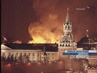 Буквально в нескольких шагах от Кремле в эти минуты бушует сильный пожар - горит выставочный комплекс "Манеж". Сигнал о возгорании поступил в 21.20, то есть буквально в те самые минуты, когда совсем неподалеку, в Центризбиркоме, начали подсчет голосов на президентских выборах. К этой теме мы еще вернемся, а пока сообщу, что площадь пожара уже превышает две тысячи квадратных метров из 4 с половиной тысяч. Ему присвоена 5, наивысшая категория сложности. К настоящему времени перекрыто автомобильное движение по Манежной площади и по Моховой, идет демонтаж троллейбусных линий, чтобы могла подъехать спецтехника.